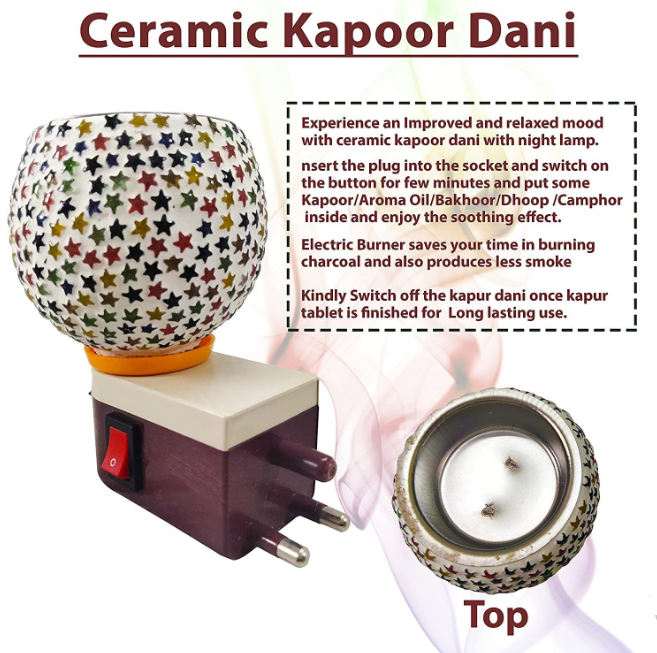 Experience traditional aromatherapy with the Multicolour Ceramic Kapoordani. This elegant ceramic aroma diffuser combines traditional Indian incense burning with modern electric convenience. Perfect for creating a soothing atmosphere with camphor, essential oils, or aromatic substances.